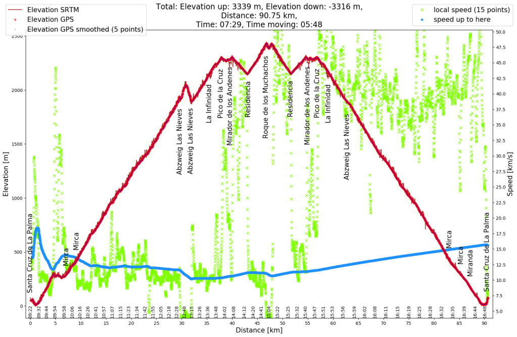 After I had been able to adapt my fitness to the landscape of La Palma by cycling for a month, I dared the big challenge of cycling towards the summit. However relaxed, I just wanted to see how far I could get. At 2000 meters I made a short excursion on foot towards Las Nieves, which gave the other muscles some rest. I think it was good that you could also see the stretch on foot based on the low speed in the profile below, so I wasn’t that slow uphill on my bike. The hardest part was after the tree line. Psychologically it felt like I was almost there, but then it’s another 4 km uphill. It is also annoying that you have to go down a bit before you can reach the summit, although the rest is also pleasant. In any case, it was a great feeling to have arrived at the top. And of course the trip back to the sea was great. As a cyclist you can even overtake cars.