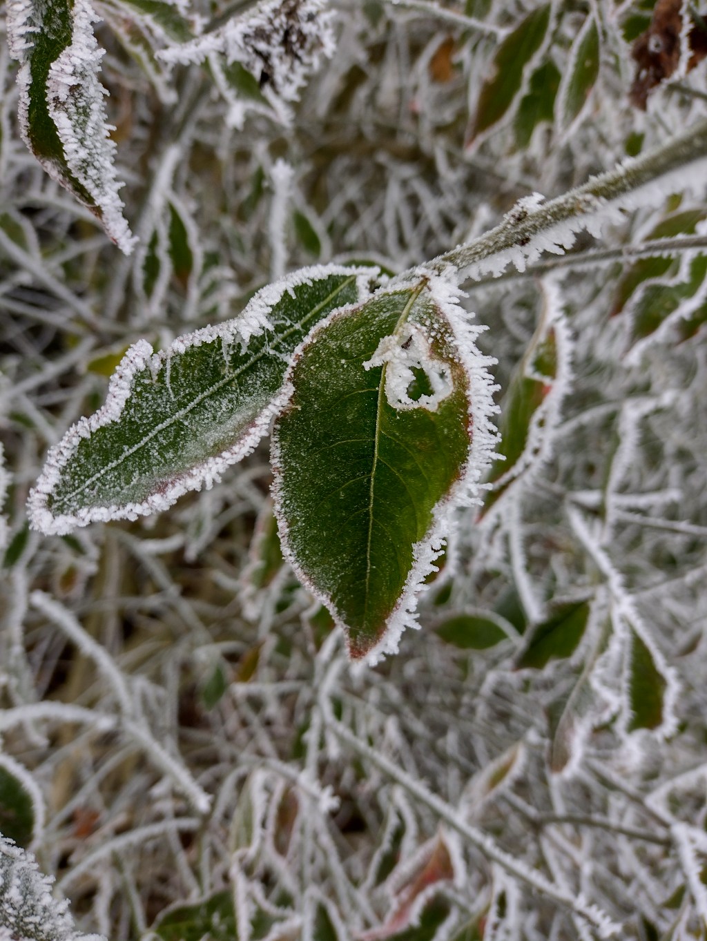After a few clear days with frosty nights, the air was a little moister last night, so that the clear days are now. Moisture on frozen ground meant riding a bike would have been an unnecessary risk. Still, I was drawn outside. Even if it wasn’t snow, ice needles look good too.